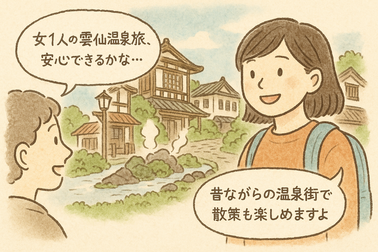 「その気持ち、わかります。でも雲仙温泉は一人でも心地よく過ごせる雰囲気があるんです。どんな楽しみ方ができるのか、一緒に見ていきましょう。」